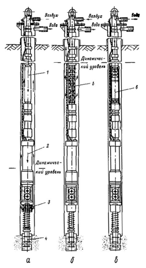 а- при низком динамическом уровне и использовании для откачки эрлифтного смесителя в корпусе виброустановки;б- при высоком динамическом уровне и возможности откачки скважины эрлифтом с отдельным смесителем;в- в случае применения для откачки погружного электронасоса;1- колонна бурильных труб;2- виброустановка;3- смеситель эрлифта в корпусе виброустановки;4- вибрационный рабочий орган;5- отдельный смеситель эрлифта, установленный в колонне бурильных труб;6- смонтированный в полом каркасе погружной электронасос